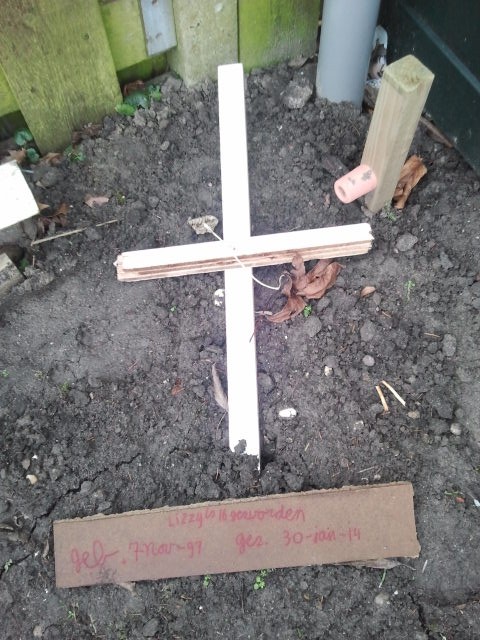 Op vrijdag mogen de jongens uitslapen vanwege een studiedag. Ik loop mijn wekelijkse rondje hard en sta even later, met mijn hardlooppak nog aan, als een crimineel na een afrekening, in de kou een gat te graven in de tuin. Zoonlief gooit vol overgave en in opperste concentratie het gat dicht en lijkt zich, een week later,  inmiddels met dit onrecht te hebben verzoend. Maar ik hoop opeens van harte dat Eddy het toch nog even vol blijft houden.
